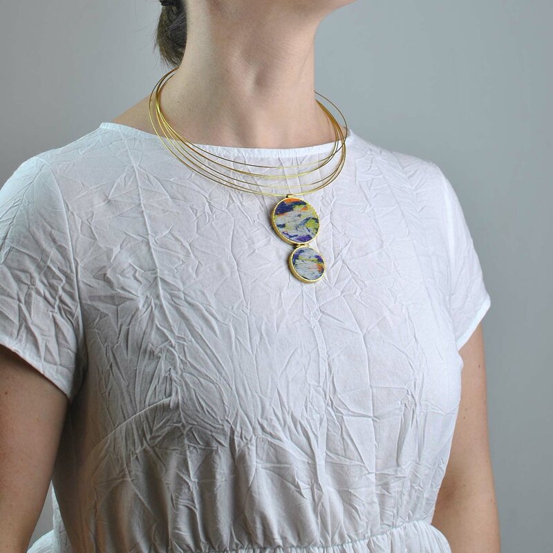 Gold plated brass and polymer clay, harmonic steel. Nickel free.