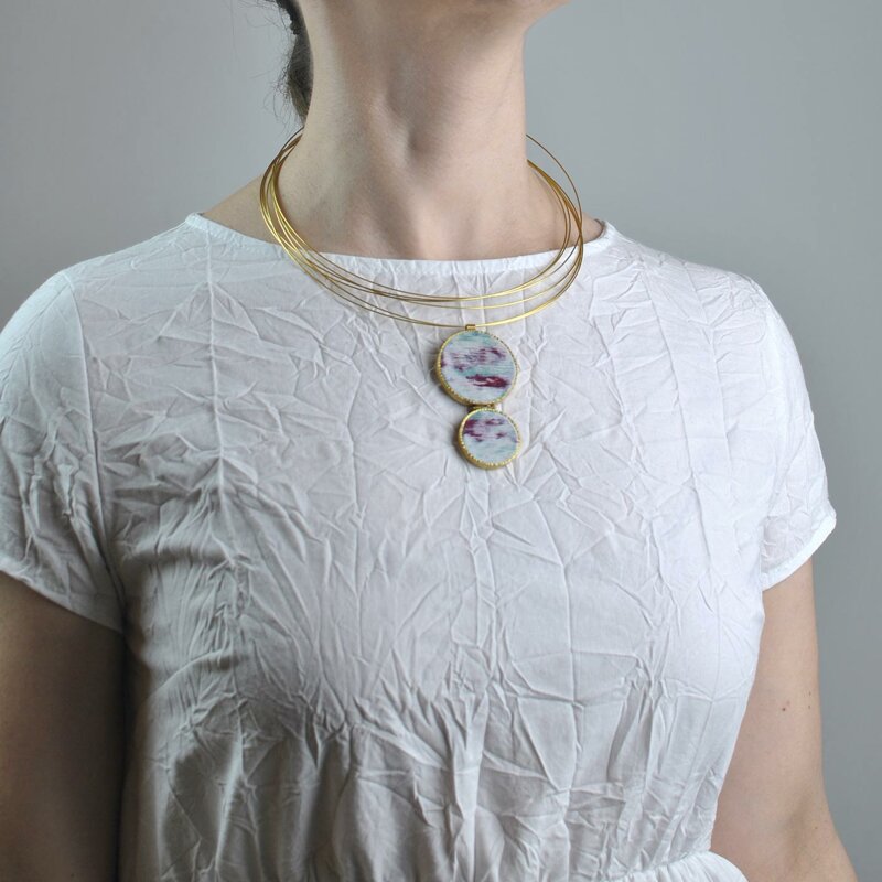 Gold plated brass and polymer clay, harmonic steel. Nickel free.